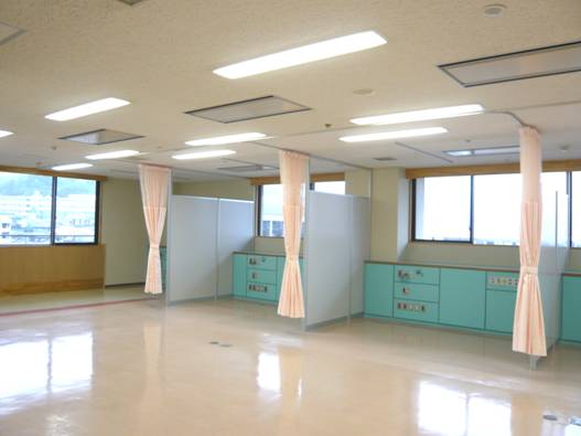 スタッフから広く見渡せる治療室スペースが出来ました。室内の床も医療空間用のシートが貼ってあります。水色のパネルは共済病院のイメージカラーということでご指定を頂きました。