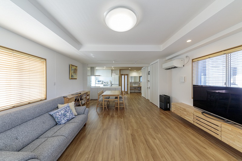 スタッフから1階の事務所とガレージ部分を改修して、お母さま、お祖母様の玄関、LDK、浴室、お祖母様の寝室、2階のお好み焼き店をお母さまの寝室に。2,3階の元居住スペースは息子さん世帯が暮らしやすくリフォームしました。3階のLDKは、テレビボード、クローゼット、デスクを造作し、フローリング、天井クロスと共にナチュラルな雰囲気に統一しました。賑やかな4世代5人と1匹の暮らしを快適に楽しまれています。