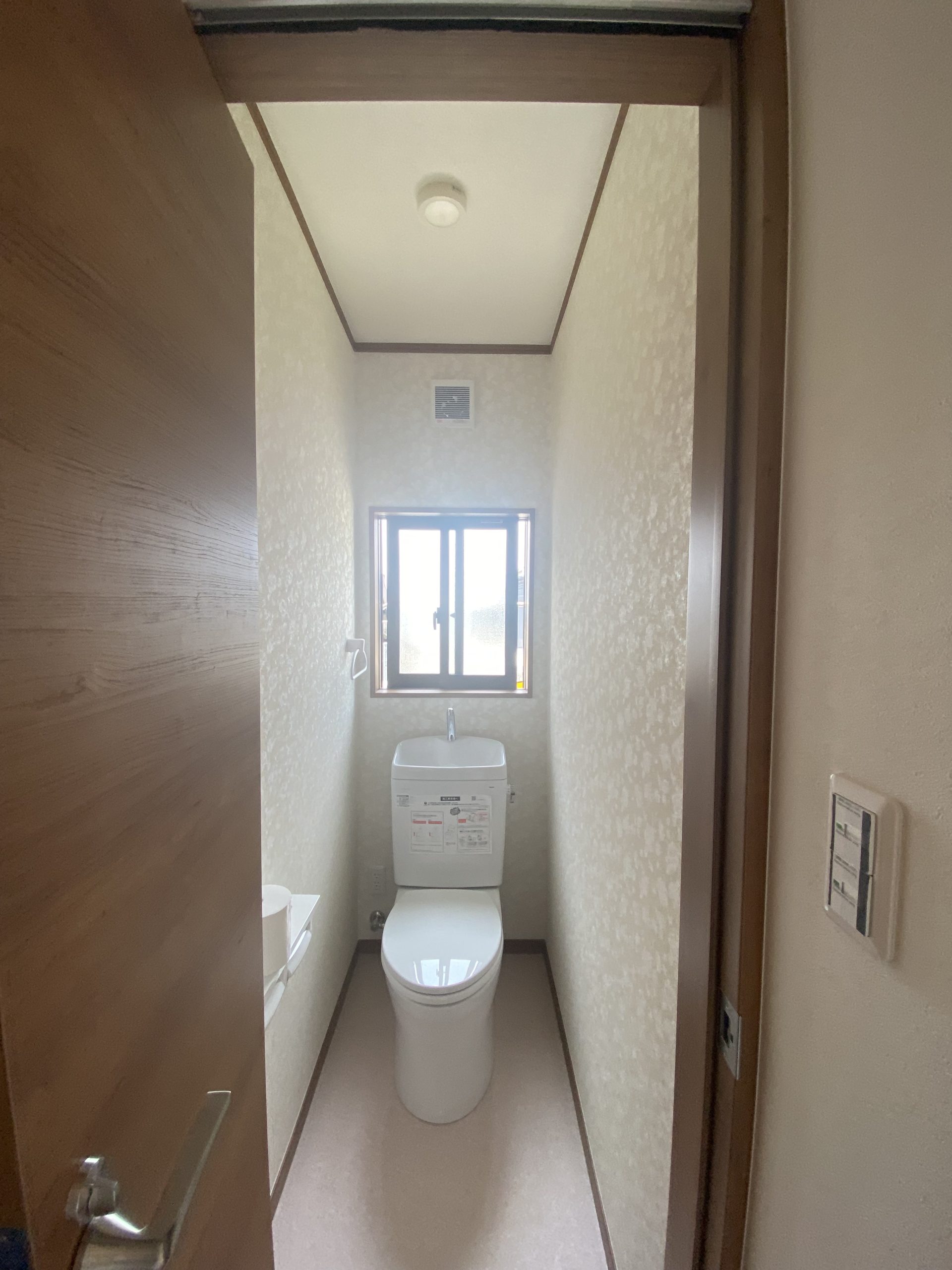 スタッフからご主人の6帖のお部屋の一部を利用して、トイレを造るご提案をさせていただきました。給排水は、外部から引き込むことができます。トイレの扉は、狭いスペースでも邪魔にならないようスライディングドアを採用しました。一緒にご主人の趣味のお部屋のクロスも一新しました。そして、エアコンも新たに取り付けて快適な空間となりました。内部、外部の階段手すりも設置して、安心な暮らしとなりました。