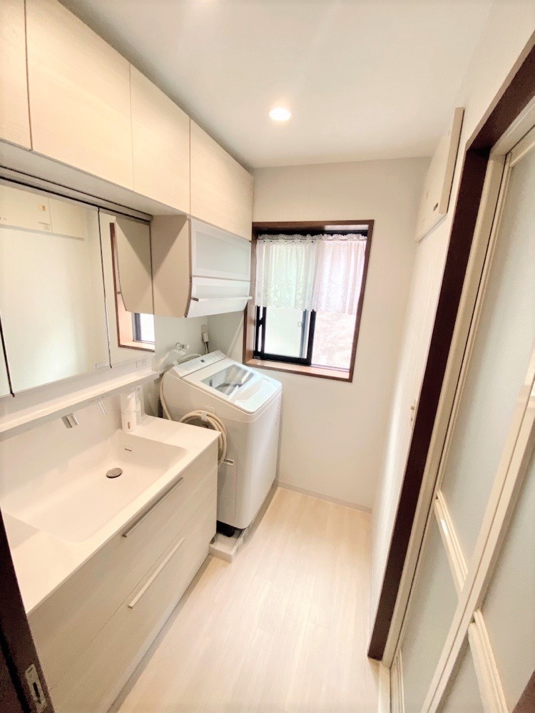 スタッフから洗面台の扉の色と床は、淡い木目調に統一し、クロスは、少し光沢感のあるホワイトを基調としたクロスに変更しました。スッキリとした統一感のある、明るい空間に仕上りました。そして、洗面台、洗濯機の上に吊戸を設け、収納力も抜群です!洗面や家事が楽しい時間になればと思います。この度は、誠にありがとうございました。