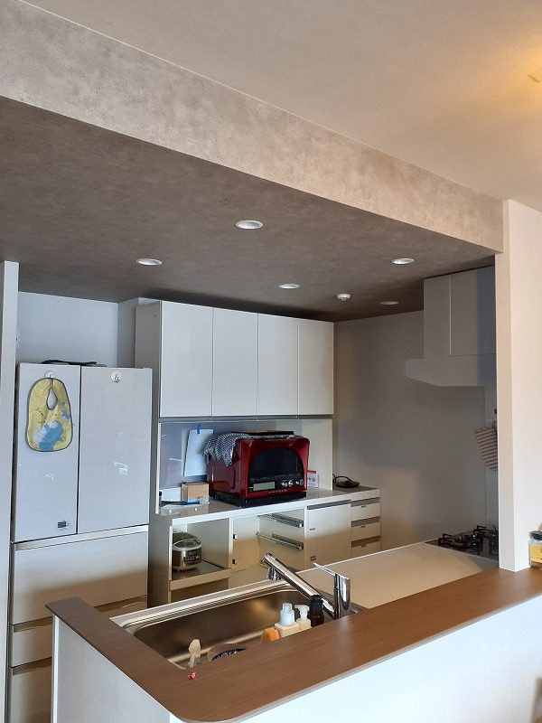お客様からキッチンの下がり天井部分におしゃれなクロスを貼りたいとお客様からご依頼をいただきました。