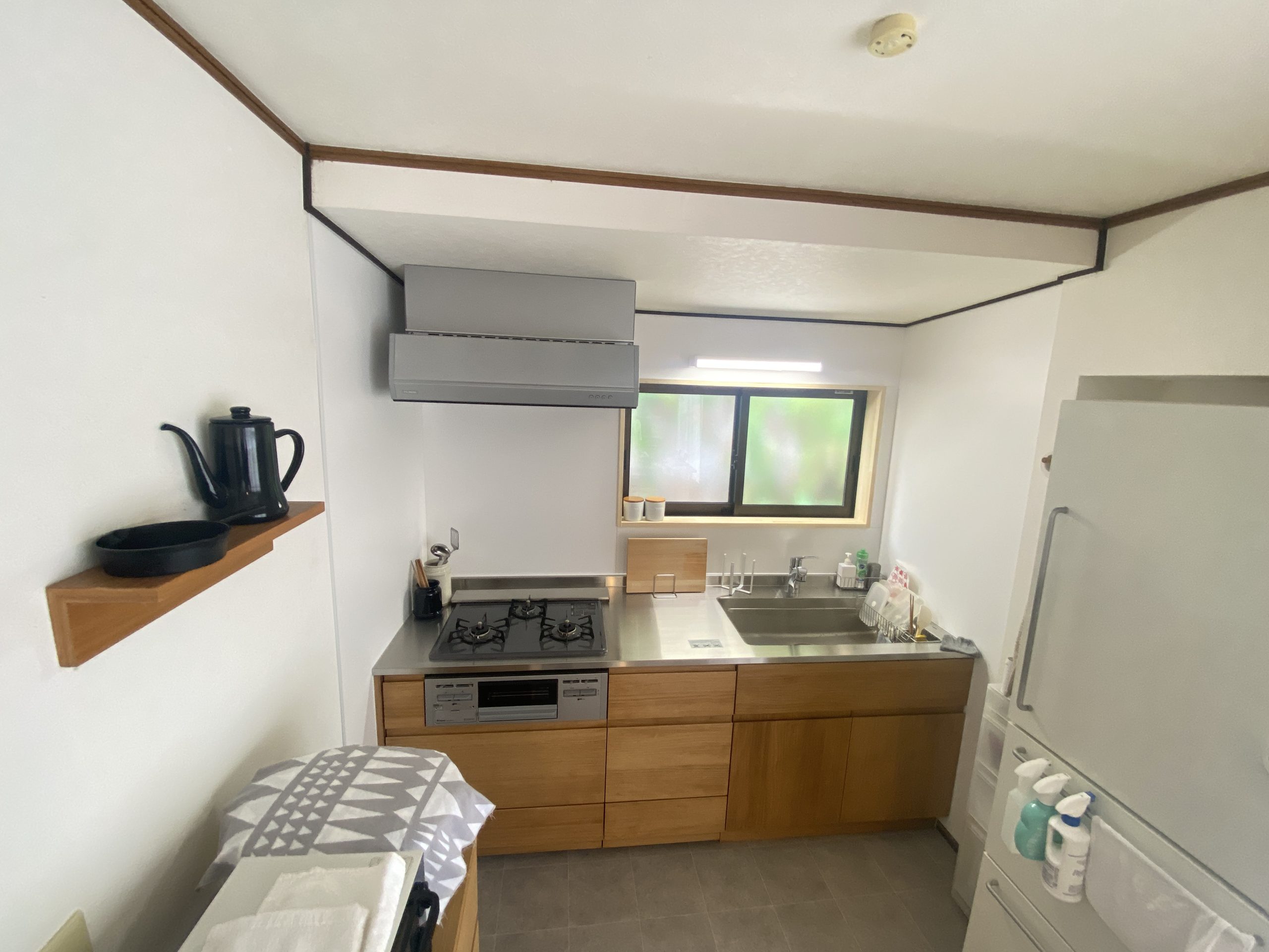 スタッフからウッドワンのスイージーシリーズのキッチンを大変気に入っていただきました。無垢材を使用したキッチンは、あたたかさを五感で感じられます。お手入れもサッと拭くだけでシミになりません。天井が低く、選べるレンジフードが限られているので、試行錯誤しましたが、シンプルでスタイリッシュな素敵なキッチンが完成しました。床のクッションフロアは、気品を漂わせる石目柄で、ナチュラルなキッチンと相性がバッチリです!この度はありがとうございました。