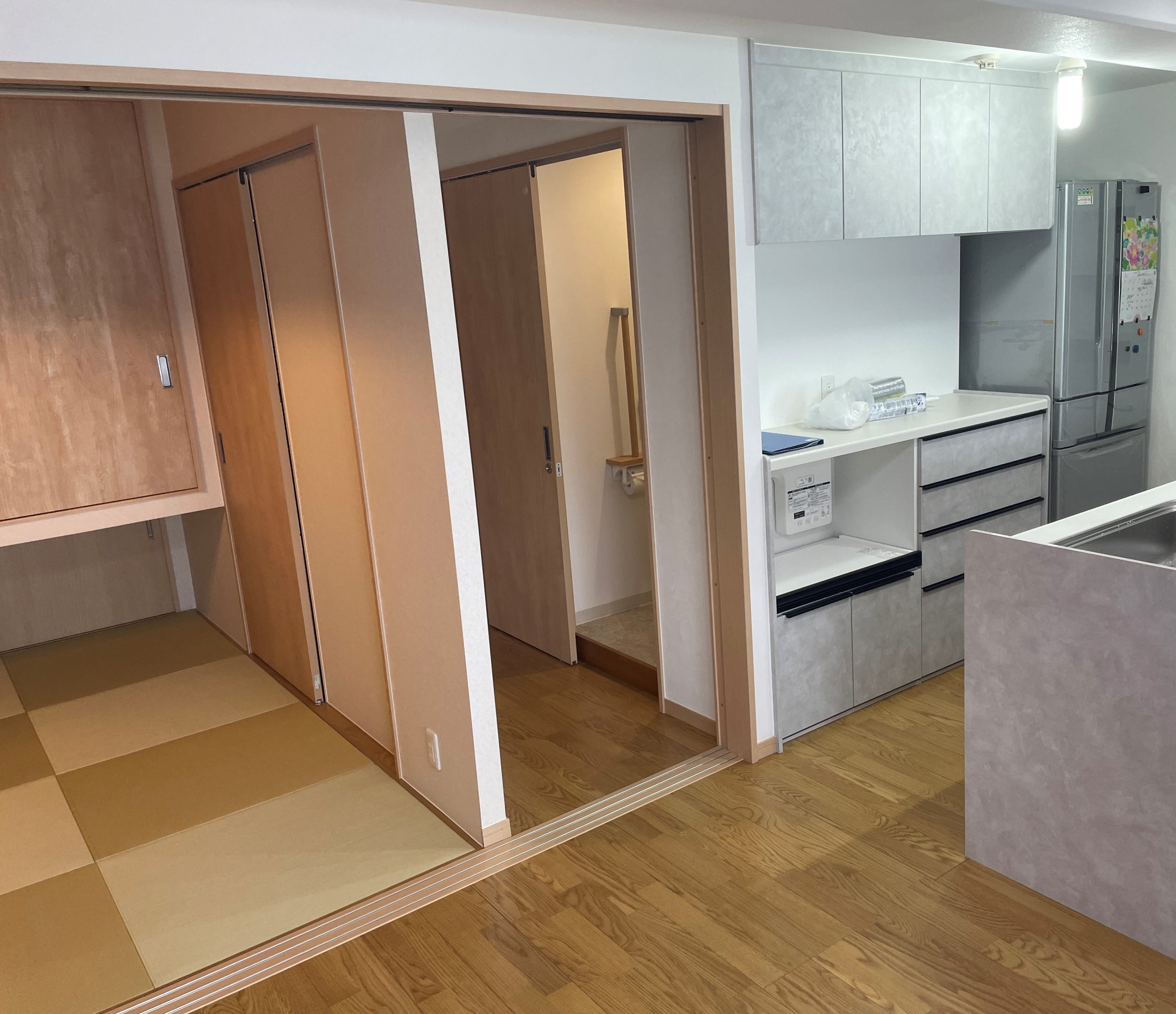 お客様からリビングとキッチンに挟まれていた和室は、使いづらく持て余していたので、LDKを広くして使いやすいようリフォームしたいとのご要望を頂きました。