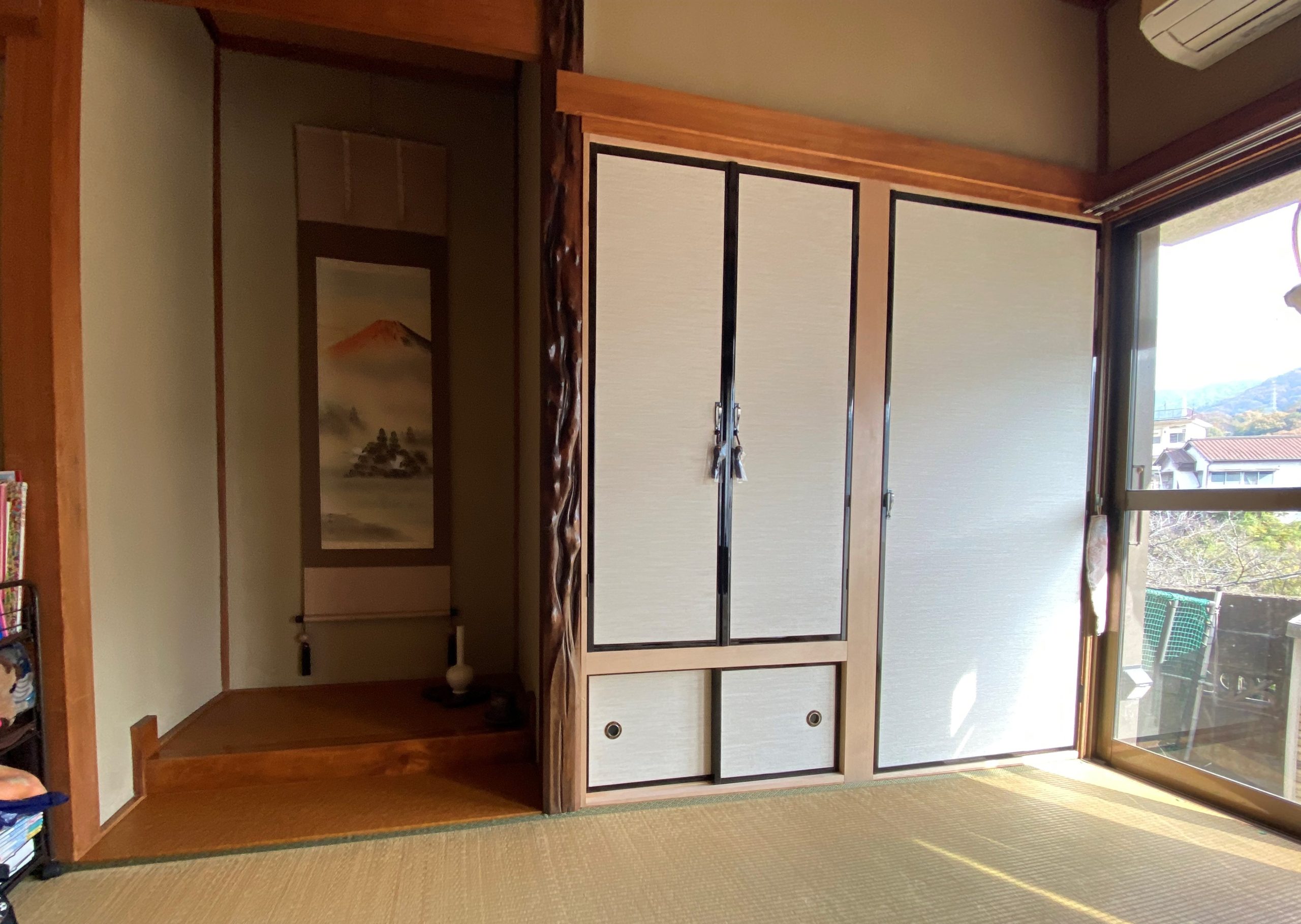スタッフから剥がれ落ちていたクロスを綺麗に剥がして、表面を整え、石膏ボードを貼り、その上からクロスを貼りました。 暗かった和室が、とても明るくなりました。