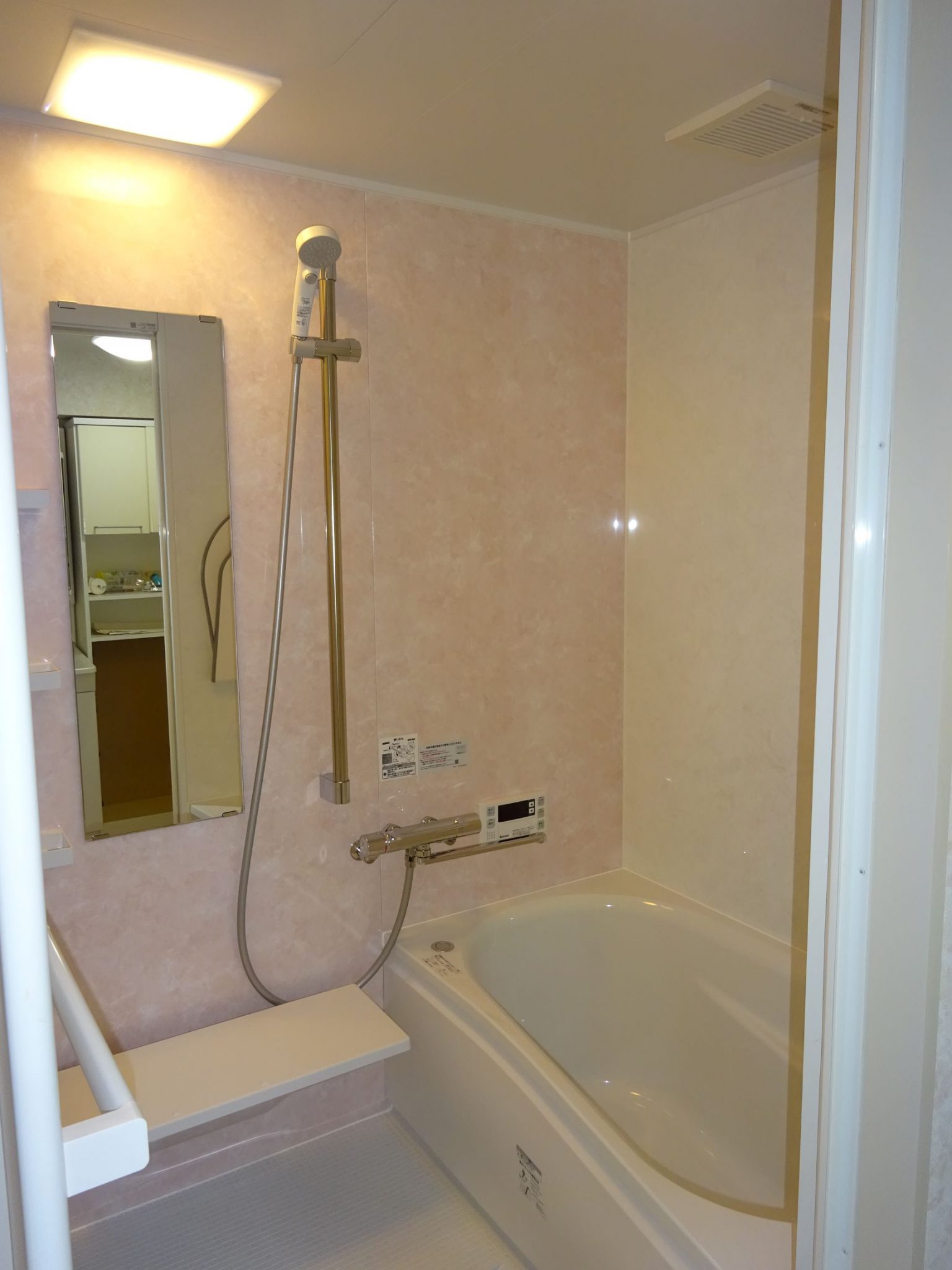 スタッフからシステムバスに取り替えし、寒々と冷たい印象だった浴室が一面を柔らかいピンクの壁にして温かみのある浴室に仕上がりました。