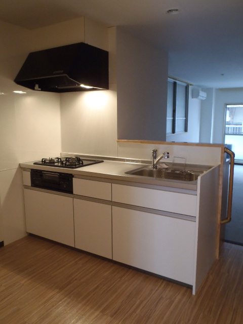 スタッフからキッチンは、華やかなペールピンクのカウンター付キッチン、フローリング等はブラッグチェリーに統一し落ち着いた雰囲気に仕上がりました。こちらはオール電化の賃貸マンションです。