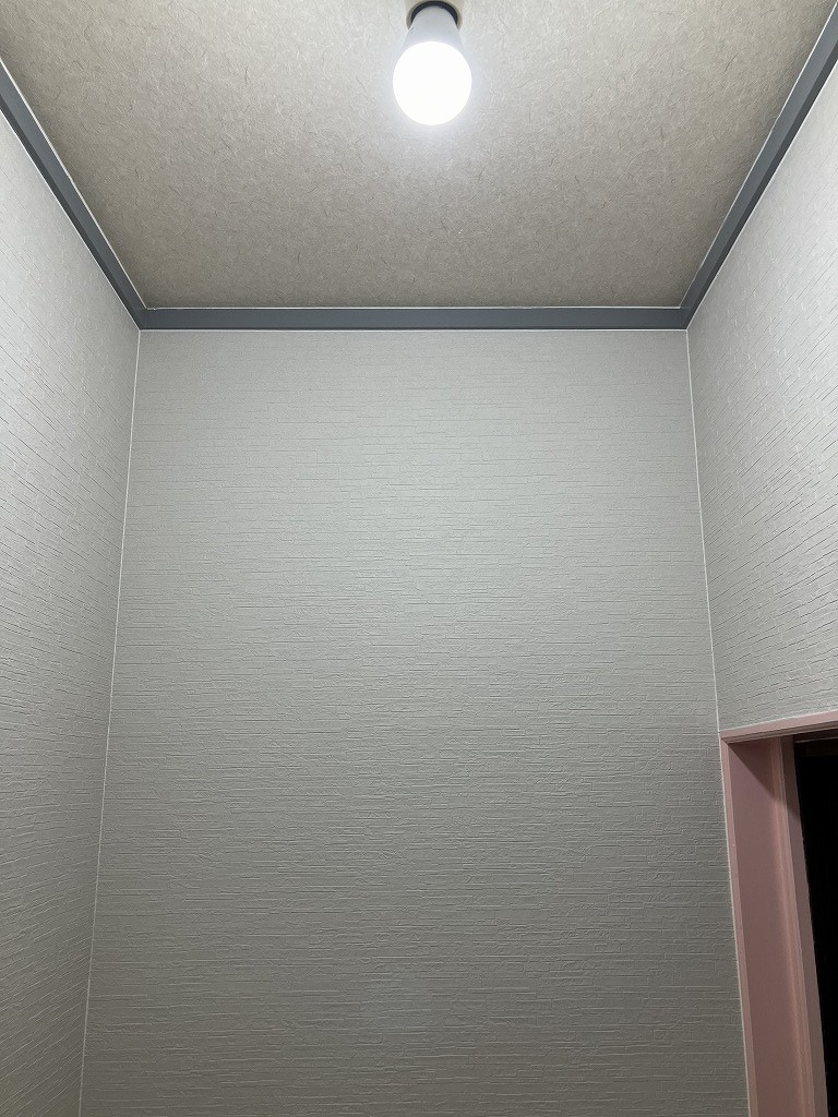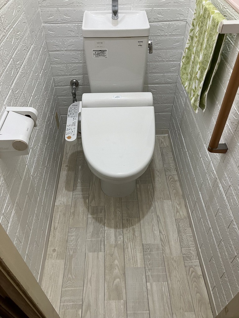 トイレ取替・床下改修と併せて壁紙の一新もご提案させていただきました。クッションフロアは出窓枠に合わせた色を選択していただいており、統一感のある落ち着いた空間を演出できました。