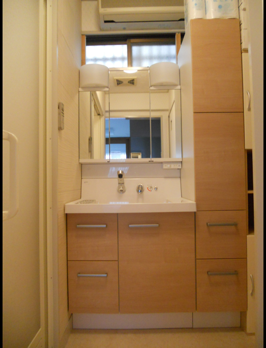 間仕切り壁がコンクリートでしたが、カットして大きいユニットバスを据え付けました。半身浴もできる浴槽の形、木目調のパネル、横長ミラーが目を惹きます。洗面台も改修に合わせて取り替えさせて頂きました。