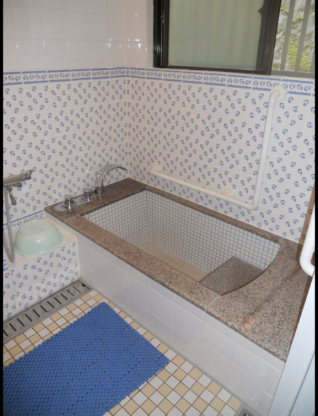 御影石とタイルで作られた浴槽に広々とした洗い場がある浴室で大変趣のある浴室でしたが、断熱面でいうと湯が冷めるのが早いという難点がありました。